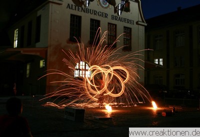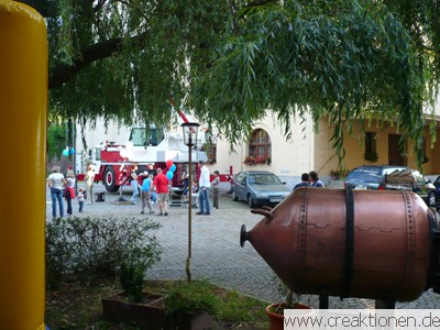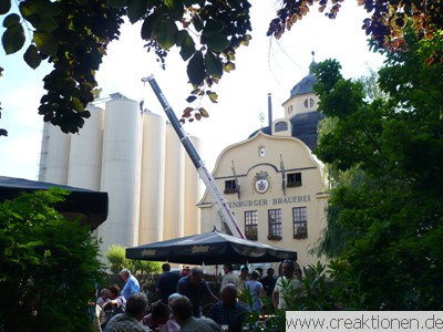 zur Veranstaltung: Mitarbeiter und Familienfest für die Deutsche Bank - Marktregion Chemnitz Juli 2008. Dafür haben wir uns in der Altenburger Traditionsbrauerei eingemietet. Wir haben die Gesamtproduktion und Hauptauftragnehmerfunktion ausgeführt. Vom Anmieten des Veranstaltungsgeländes (u.a. einen Sportplatz für Fußballturnier), sämtliche Leistungsgruppen, vom Catering, Aktionsmodule, Programm wurden durch uns ausgeführt. Während die Erwachsenen Brauereimuseum besuchten, oder Brauereiführung machten, konnten die Kids sich von der Hüpfburg bis zum Wii-Turnier beschäftigen. Neben verschiedensten Animateuren und Dj hatten wir zum Abschluss mit Projekt Fire eine fantastische Feuershow im Programm. Übrigens wenn wir Bierkasten stapeln machen, stehen bei uns Leute am Seil, die eine Rigging-Ausbildung haben. Am Abend stellte sich heraus, das zufällig ein Kindergruppe aus der Gegend Tschernobyl in der Brauerei-Herberge war. Spontan haben die Kinder alles was an Spielzeug und Präsenten da war geschenkt bekommen. |